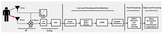 This creates measurement vectors or point clouds that show the physical properties of the scene [41,61]. Obtaining raw 3D radar data is the first step in processing radar signals. Each antenna then goes through range processing using 1D windowing and 1D Fast Fourier Transform (FFT). Following this, a static clutter removal procedure is employed to filter out stationary objects, isolating signals emanating from moving objects. Techniques such as capon beamforming are utilized to formulate a range-azimuth heatmap, with object identification being executed through a constant false alarm rate approach. Further refinement is accomplished through elevation and Doppler estimations, which ascertain the angular positions and radial velocities of detected objects [61].