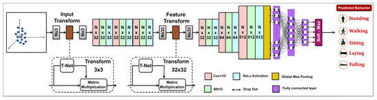 In our methodology, the PointNet architecture processes raw point cloud data to classify the points into one of five categories: standing, walking, sitting, lying, or falling. The architecture shown in Figure 4 begins with an input layer for a set of cloud points , where n represents the total number point count, with each point being characterized by its Cartesian coordinates. in a 3D Euclidean space, designed to accommodate point clouds with a shape representing the number of points and three coordinates. Following the input layer, the model proceeds with an input transformation network (T-net), which operates on the raw point cloud data. A significant aspect of PointNet is the incorporation of T-net, which aims to spatially align the point cloud data, helping in learning rotation and translation-invariant features. In the architecture of the PointNet model, following the initial T-net, there are three 1D convolutional layers (Conv1D), each comprising 32 filters. Following each convolution operation, the convolution output undergoes 1D batch normalization (BN1D) for normalization purposes. Subsequently, a Rectified Linear Unit (ReLU) activation function is employed to introduce nonlinearity, aiding the model in learning from the data. This is achieved by applying . The model then goes through another T-net to align the feature representations. It also aligns the feature space with a transformation matrix, using a regularization term to ensure near orthogonality and stable optimization.