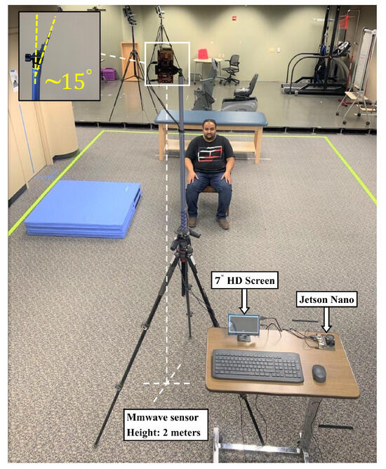 The experimental setup aimed to acquire data on human activities within a simulated home environment. A mmwave radar sensor, specifically the IWR6843ISK-ODS model, was positioned on tripods at a height of 2 m, as shown in Figure 6. The radar was tilted by 15 degrees in the depth-elevation plane to enhance coverage over a designated 12-square-meter area. This area was designed to mimic a living room setting, with furniture like chairs, floor mats, beds, and walking space. The primary target for detection was the human subject, as depicted in Figure 6.