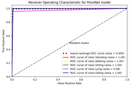 The assessment of the model included ROC curve analysis, which is commonly utilized as a diagnostic instrument for evaluating the performance of classification models. This is achieved by evaluating the trade-off between the true positive rate and the false positive rate across different discriminatory thresholds. The present study involved the application of ROC analysis to assess the accuracy of the radar in identifying the five predetermined physical activities.