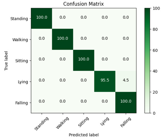The confusion matrix is a useful tool for assessing the effectiveness of classification models. The abscissa represents the true labels, whereas the ordinate represents the predicted labels. Enhanced model performance is shown by a higher concentration of predicted values along the diagonal of the confusion matrix. In Figure 9, the confusion matrix visually portrays the classification performance. Notably, all activity classes are classified with excellent accuracy. While ‘Lying’ and ‘Falling’ have certain similarities in terms of their proximity to the ground and body posture, the key distinguishing feature between them is the height at which the human target is positioned above the ground surface, which differs greatly between the two. Radar’s ability to generate a three-dimensional representation allows it to overcome these hurdles, resulting in highly effective classification performance.