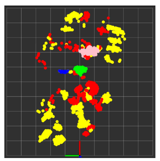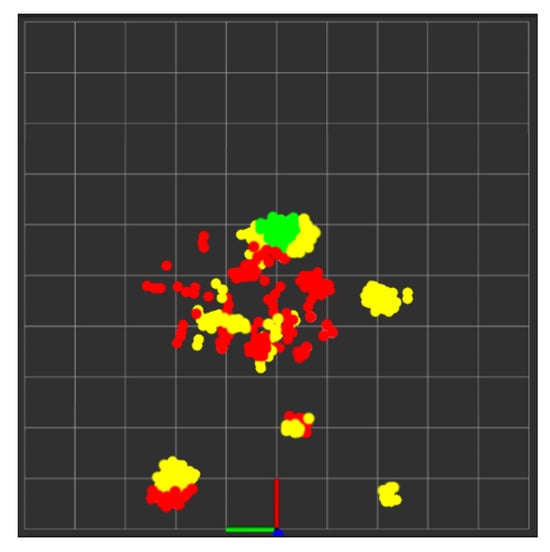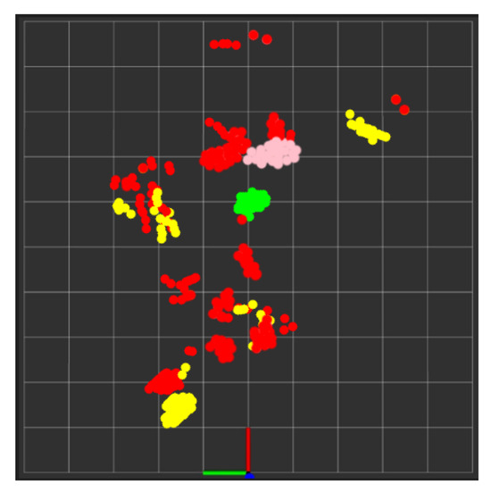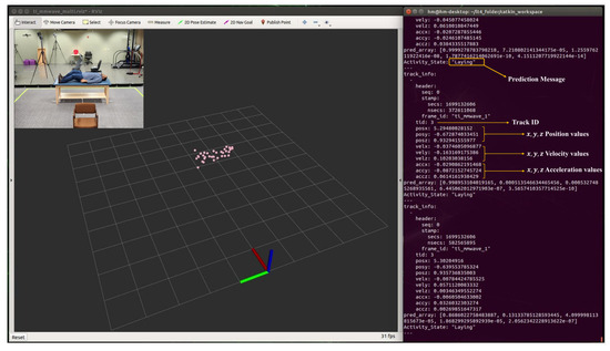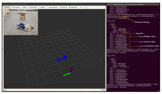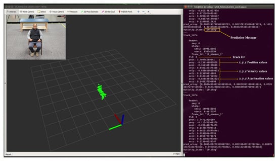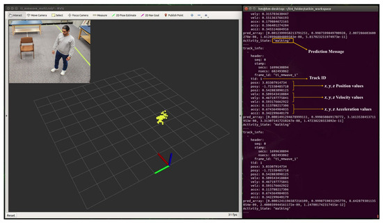 During real-time monitoring of the five different activities (standing, walking, sitting, lying, and falling), we assigned each activity a specific color: red for standing, yellow for walking, green for sitting, pink for lying, and blue for falling, which gives an easy way to discern between each. This is shown in the following Figure 10, Figure 11, Figure 12, Figure 13 and Figure 14, where each human target appears in the field of view by the mmwave sensor and is given a specific trackID, and then the cloud points are recolored according to the current activity and the prediction message that is displayed on the Rviz screen of the Jetson Nano in the “Activity_State” parameter with position, velocity, and acceleration values of x, y, and z dimensions. These values are continuously updated to provide a comprehensive description of the target’s spatial location in a Cartesian coordinate system. Real images have been added to the figures for illustrative purposes.