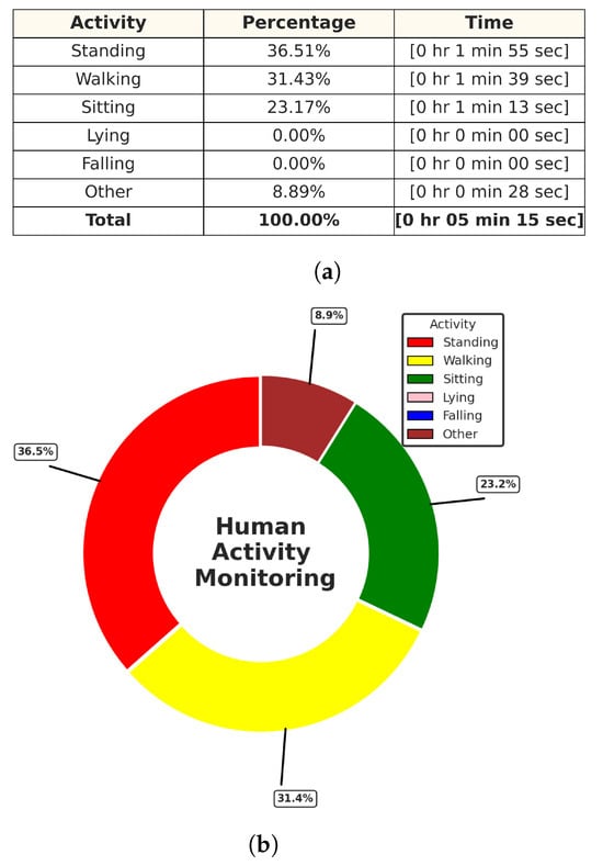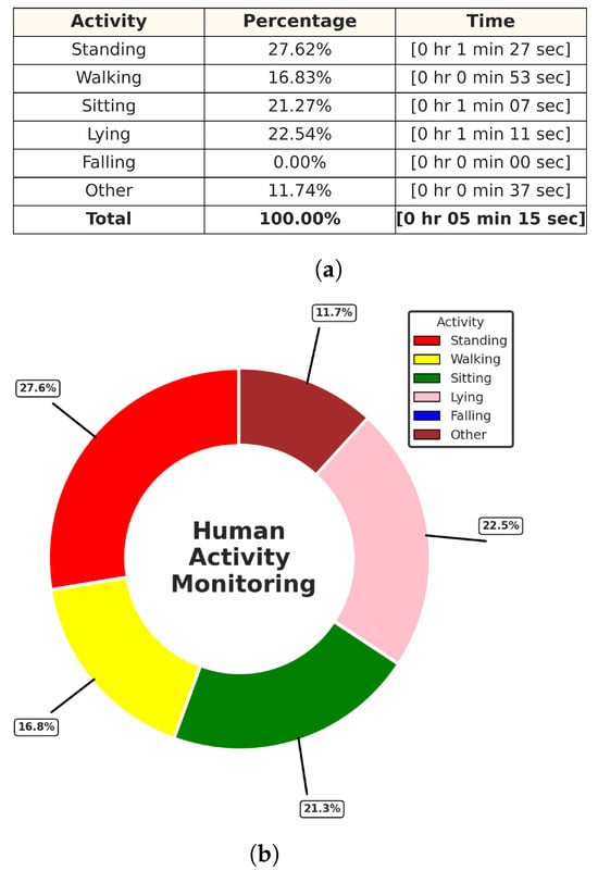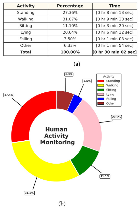 Activities monitoring report of track ID: 3. (a) Table of the time distribution of activities. (b) Pie chart of the time distribution of activities.