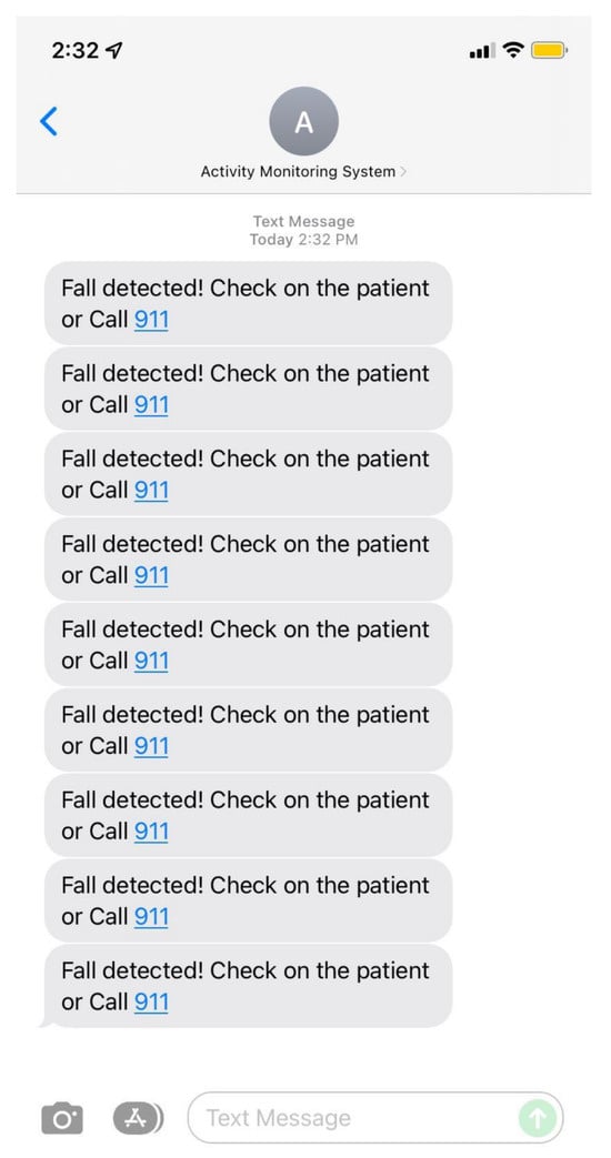 In this experiment, we monitored one human target for about 30 min, and after that, the system produced a separate folder for the target as we did in the previous experiment shown in Figure 19 and Figure 20. Additionally, we tested the fall alert feature to see how accurately a fall was detected by the system. If a fall was detected, the Twilio REST API was immediately activated to send an SMS notification and make an alert call. The resulting SMS notification is shown in Figure 21.