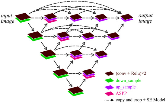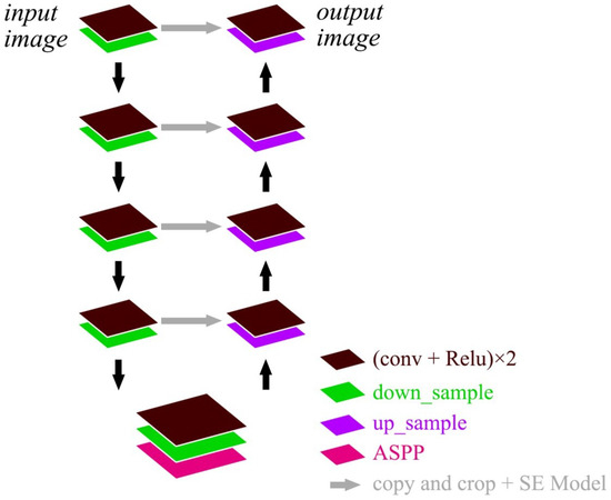 The SE model is added to the feature fusion part of each layer, which can automatically evaluate the importance of each feature channel. Different weight coefficients can be added to each channel such that important features are strengthened and unimportant features are suppressed. After the convolution and activation function in the last layer of the network, adding an ASPP module can expand the sensory field such that information loss can be minimized and the network’s ability to capture multi-scale information is improved.