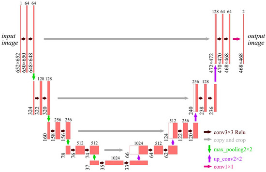 Each layer between the two parts will conduct a 3 × 3 convolution operation, which is labeled by the brown arrow in Figure 2. Then, it is followed by a Relu activation function layer. The operation mode of the convolution operation is a valid mode where the stride is 1 and the convolution kernel is 3 × 3. Since the padding is also not set, the image size will be reduced by two after each convolution operation. The last layer of the output is classified by a 1 × 1 convolution layer, which is shown by the magenta arrow in Figure 2.