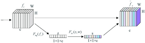 The SE module contains two main operations, squeeze and excitation, which are and in Figure 5. is the feature map with feature channel c, H is the height of the feature map, and W is the width of the feature map. z is the feature vector of 1 × 1 × c, s is the weight, and is the weighted feature channel. The compression operation is represented by the following equation: