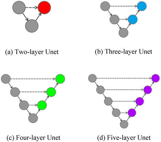 Unet++ is a network structure connected by a combination of different layers of Unet, and different layers of Unet can realize the extraction of different depth features. Figure 6 shows the Unet structure with different depths.
