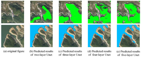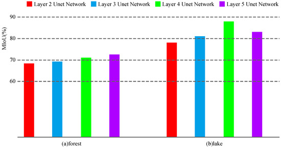 As can be seen from Figure 8, the segmentation performance for forests can be improved by adding the number of network layers. However, for lakes, the Unet with four layers performs better than the Unet with five layers.