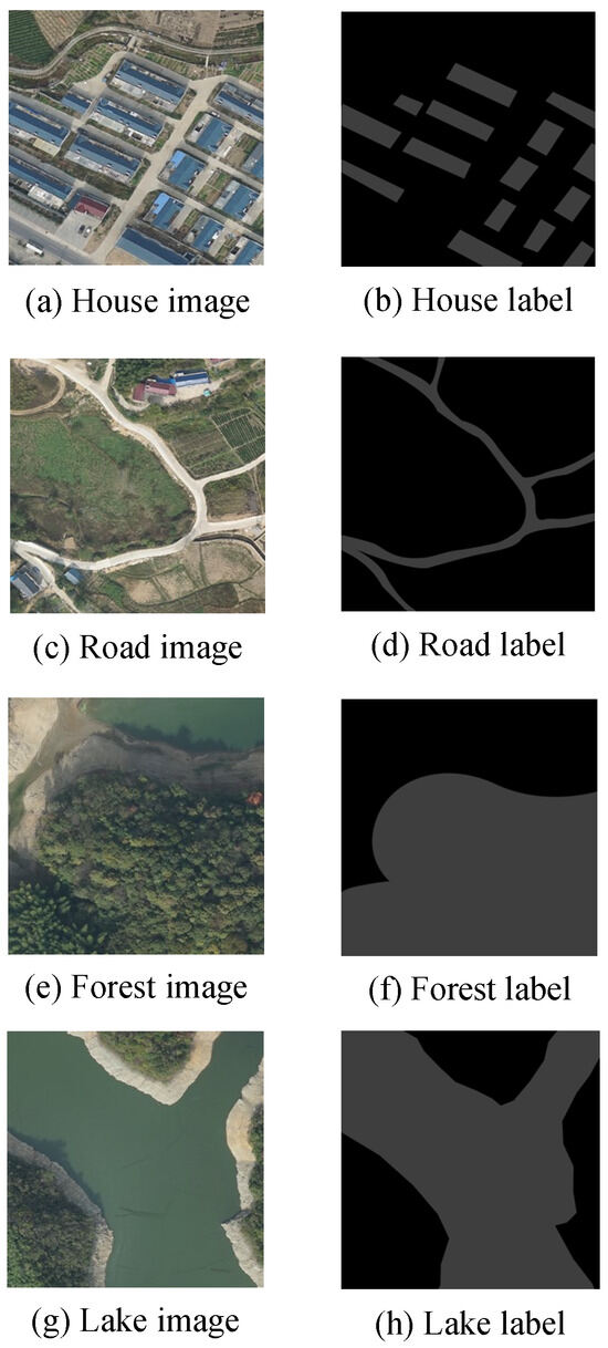 The labels of the images are created using QGIS, and different shades of gray are used to refer to different things in the image. Pixels of the same type of things are labeled with a fixed gray value, and the background is solid black. Figure 11 shows the images of houses, roads, forests, and lakes along with the labels.