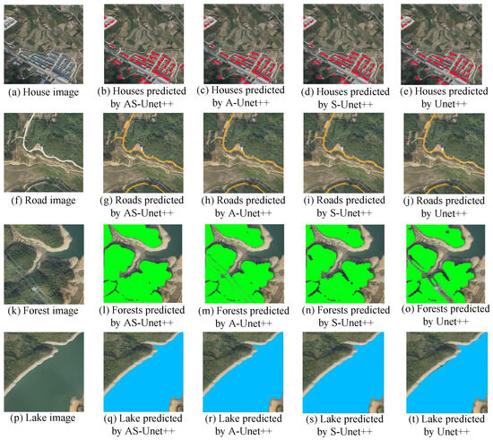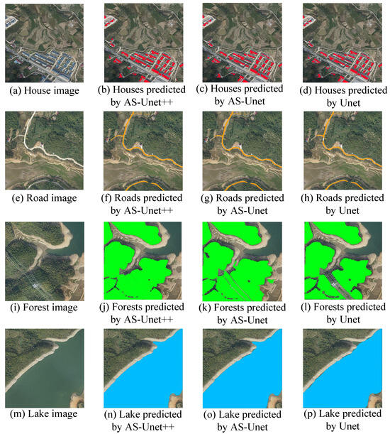 Figure 16 shows a comparison of the predicted segmentation images of houses, roads, forests, and lakes achieved by the three networks.