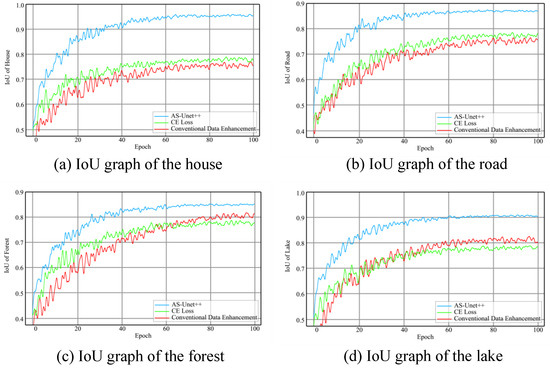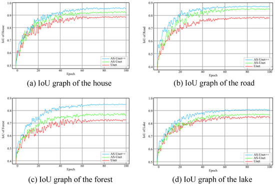 Compared with the AS-Unet and Unet network, the MIoU of the AS-Unet++ network increased by 3.1% and 8.1%, respectively. In Figure 13, the overall convergence speed of the three kinds of differences was small, and, only in the road elements recognition training, the AS-Unet++ network convergence speed was slightly faster than the other two networks. In addition, in the training process, AS-Unet++ compared with the other two network oscillations was smaller, especially in the roads, forests, and lakes element recognition training. In the identification of house elements, the Precision index increased by 2.7% and 6.4%, the Recall index increased by 3.2% and 7.4%, and the IoU index increased by 3.1% and 7.3%, respectively. In the recognition of road elements, the Precision index increased by 2.5% and 9.3%, Recall increased by 2.1% and 9.6%, and IoU increased by 2.2% and 9.3%, respectively. In the recognition of forest elements, the Precision index increased by 6.8% and 14.5%, Recall increased by 6.8% and 13.8%, and IoU increased by 6.7% and 14.0%, respectively. In the identification of lake elements, the Precision index increased by 4.5% and 6.0%, Recall increased by 4.6% and 5.8%, and IoU increased by 4.3% and 5.7%, respectively. The improvement of forest identification accuracy was particularly obvious.