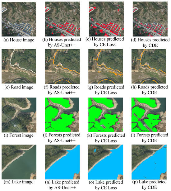 It can be seen from the above data that AS-Unet++ is superior to CE Loss and CDE in each index of the test sets. Compared with CE Loss and CDE, the MIoU of AS-Unet++ increases by 12.3% and 12.1%, respectively. In the identification of house elements, the Precision index increased by 20.1% and 21.4%, the Recall index increased by 19.2% and 20.5%, and the IoU index increased by 19.7% and 21.3%, respectively. In the recognition of road elements, the Precision index increased by 10.1% and 8.8%, the Recall index increased by 10.1% and 9.4%, and the IoU index increased by 10.3% and 10.5%, respectively. In the recognition of forest elements, the Precision index increased by 7.8% and 7.0%, the Recall index increased by 5.5% and 4.8%, and the IoU index increased by 6.6% and 5.8%, respectively. In the recognition of lake elements, the Precision index increased by 14.0% and 11.4%, the Recall index increased by 11.9% and 10.0%, and the IoU index increased by 12.9% and 10.8%, respectively.