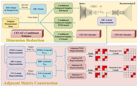 Here, and , respectively, denote the mean and covariance matrix of the data generated utilizing the latent variable z. Based on the assumptions mentioned above, we can derive . However, for high-dimensional data, is challenging to infer, which indirectly leads to the posterior probability distribution of the latent variable z as , which is also not inferable. Therefore, we employ a CVAE, specifically two fully connected layers, to generate the approximate posterior probability distribution to approximate . However, since the Hadamard product utilized to obtain the interacted data introduces a more vital structural constraint [30], we simultaneously sample from the standard normal distribution , ensuring that the constraint is effectively considered during the training process. To more lucidly show the construction process and its practical implications, we selected an ER as the object for the investigation of the dimensional reduction method in the following sub-sections, as shown in the top-right section of Figure 2. The features of the PTSS and CS are reduced using the same method but are not shown in Figure 2.