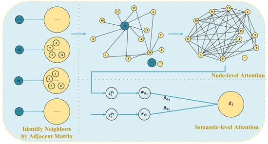 where k represents the number of neighbors, represents concatenation, and represents transpose. These weights represent the importance of the neighbors to the target node based on a particular meta-path. Then, using these weights, we generate the feature of node i aggregated from the surrounding neighbor nodes to capture the complex relationship between the node and its neighbors: