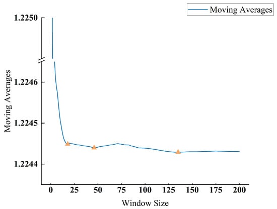 The proposed model requires the determination of some key parameters alongside the hyperparameters that need empirical and temporal trials. These key parameters include the threshold values utilized in constructing adjacency matrices and the size of the time window. We utilized the method in [33] to determine the suitable window size for the given ER sequence. Specifically, the moving average of the time series was computed for a given window size. The moving average was derived by computing the average value of each continuous sub-sequence in the time series. For each window size’s moving average, the absolute distance of these moving averages from their overall average was computed, denoted as the moving-dist meta-time series. The optimal window size was determined by locating the position of the first valley in the moving-dist meta-time series. As shown in Figure 4, a window size of 18 was deemed suitable.