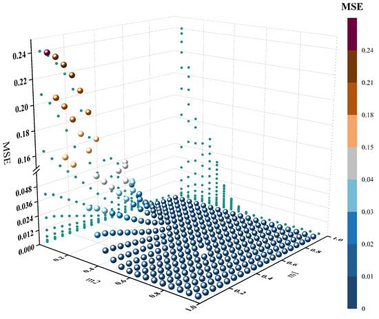 The described scenario entails hypersonic aircraft undergoing testing, during which structural vibrations, motion-induced noise, and electromagnetic interference may disrupt the test parameters. The adjacency matrix, representing the connectivity relationships between subsystems, is crucial to the model’s robustness. An overly sensitive adjacency matrix could offer better stability but might forfeit some vital information for the HGANN model. The optimal threshold for the adjacency matrix was determined by analyzing the Mean Squared Error (MSE) of the adjacency matrices before and after adding standard Gaussian noise under varied threshold values, as shown in Figure 5. As the sensitivity values increased, the MSE transitioned from a steep decline to a more gradual one. To balance the adjacency matrix’s information retrieval capability and stability, the saddle points x and y were selected as the sensitivity values, with and being 0.63 and 0.58, respectively. A simple visualization elucidates the selection method, with the x-axis in Figure 6 representing the sensitivity used in calculating the Euclidean distance and the y-axis representing the MSE under two adjacency matrix construction methods. Notably, in the proposed method’s curve, one corresponds to multiple values, where represents the sensitivity used in calculating the Pearson coefficients. Figure 6 also demonstrates the robust stability of the proposed adjacency matrix construction model, which, to some extent, substantiates the necessity of using Pearson coefficients as a secondary verification of the connectivity.