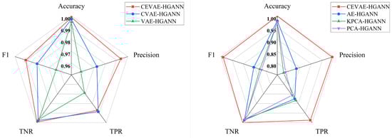 The information in Table 1 indicates that the impact of dimensional reduction on the edge number was not definitive. However, a noteworthy increase in the -Score, ranging between 0.06% and 0.91%, can be observed. Further, the graphical representation elucidates the comparative advantage of generative dimensional reduction methods over non-generative ones for the ER subsystem, as shown in Figure 7. Particularly, CEVAE emerged as the most effective method among the evaluated techniques. The performance metrics exhibited substantial improvements, where the Accuracy increased from 0.15% to 2.61%, Precision increased from 2.12% to 21.61%, TPR increased from 0.14% to 13.06%, TNR increased from 0.17% to 1.94%, and -Score increased from 1.00% to 17.01%. These metrics underscore the positive impact of effective dimensional reduction on the construction of adjacency matrices. In addition, as seen in Table 2, the edge number was reduced from 97.962% to 98.178% when employing the Pearson correlation coefficient for secondary verification. However, despite this significant reduction, the -Score increased from 0.50% to 0.89%. This indicates that a large proportion of the neighboring nodes in the adjacency matrix might be redundant or possibly noise-inducing, which could adversely affect the weight analysis of the target nodes. The Pearson correlation coefficient, serving as a secondary verification method, appeared to efficiently filter out these redundant or less informative edges, thereby refining the structure of the adjacency matrix. A well-structured adjacency matrix is instrumental in efficiently directing the “flow” of information along defined pathways within the network.