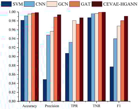The performance of the CEVAE-HGANN model was evaluated using multi-classification metrics. The employed evaluation metrics included the Accuracy, Precision, TPR, TNR, and -Score. The formulas for these metrics are as follows: