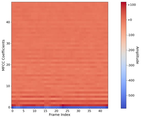 The paper performs MFCC feature extraction on experimental samples of duration 1 s. The frame length FFT of the data subframes is 2048 points, and the neighboring frames overlap 1536 points. The number of Mel filters is set to 50, and a total of 44 groups of MFCC data are obtained, which are spliced into a two-dimensional array in chronological order to obtain the MFCC data as shown in Figure 2 below, as a sample for underwater target recognition. This sample is flattened before inputting into the network, and the data length is 2000.