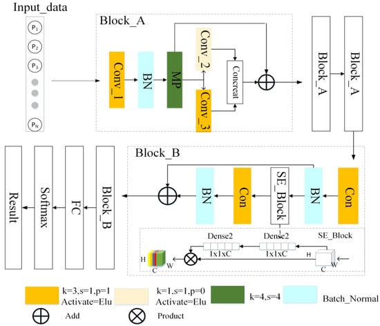 The initial layer of Block_B in Figure 3 consists of a convolution layer with 1 × 3 kernel size, followed by a BN layer. The output of this layer is fed into the SE_Block, which employs automatic learning to determine the significance of feature maps in various dimensions. This results in a weight matrix that is multiplied by the feature maps. Channels with a higher weight value indicate greater importance, leading to higher correlation with classification recognition. SE_Block demonstrates the implementation process of the attention mechanism. The implementation process of the SE mechanism is shown in Figure 3, where the numbers of N and C are set to 1/16 of the number of input feature map channels and the number of input feature map channels, respectively. When the data pass through the SE module, each channel of the input feature map is multiplied by a weight factor, which enhances the channels with representative feature maps and reduces the importance of the data of the unimportant channels, which in turn reduces the network’s attention to them. The output of the SE_Block is then fed through a convolutional layer and added to the output of the first convolutional layer of Block_B, serving to prevent overfitting and further fit the signal feature.