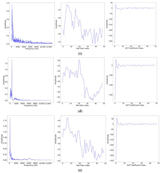 Results of FFT, Mel filter bank, and DCT of different radiated noise. (a) Natural noise in Class A. (b) Tugboat noise in Class B. (c) Motorboat noise in Class C. (d) Passengers noise in Class A. (e) Ocean liner noise in Class E.