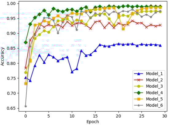 In the RACNN model, Block_A incorporates multi-channel and residual connection mechanisms to enhance feature extraction and improve the convergence rate of the data, as well as to avoid gradient vanishing and explosion issues. Block_B features residual connection and attention mechanisms to prioritize critical information for classification and recognition. The number of Block_A and Block_B, as well as the units of the FC layer, can impact the performance of the RACNN. To evaluate the impact of each block and determine the optimal parameters for the RACNN model, we proposed a series of networks with different configurations. The parameters and performance of the six typical networks, namely Model_1 to Model_6, are presented in Table 2 and Figure 5. The experimental results show that by testing on the ShipsEar dataset, the best accuracy of the model validation set can be achieved as 0.9934, while the network parameters are 149 K and the computational FLOPs(G) is 0.139.