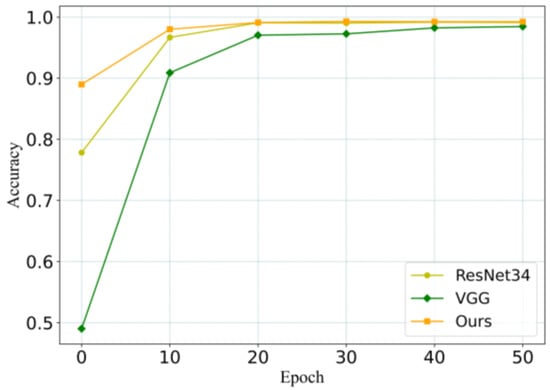 In order to further evaluate the performance of the proposed RACNN model, we applied some classical deep learning classification networks to recognize underwater targets, such as Vgg16 [28] and Resnet34 [29], and compared the performance of these networks. After these networks were modified to accept underwater target data as input, they were trained using randomly initialized parameters. The experiment results are shown in Table 5, and the training process is shown in Figure 8. The experiment process indicated that RACNN began to converge after approximately 10 iterations due to the incorporation of residual and attention structures. Other networks required around 20 iterations to stabilize. Compared with Vgg16 and ResNet34, the RACN network achieved the highest accuracy of 0.9934, which is 1.04% and 0.22% better than Vgg16 and Resnet34 networks, respectively.