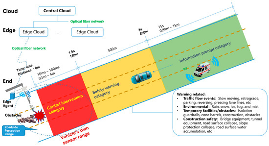 Based on the mechanism of vehicle dynamic distance envelope warning, when vehicles on highways pass through specific scenarios, according to the cloud control platform architecture and beyond the line-of-sight perception–distance division model of the vehicle-infrastructure–cooperative autonomous driving edge-container–cloud edge cooperative model, this vehicle will be in three alternating states during driving: information prompt type, safety warning type, and control intervention type [6]. Assuming that there is an obstacle at the deployment point of Class A equipment in the intelligent infrastructure of the expressway, after the roadside perception system recognizes the road obstacle, it will send different application scenario information to the vehicles in the way through the roadside intelligent terminal RSU (Roadside Unit, RSU) according to the distance from the obstacle. When the vehicle is 0.8–1 km away from the obstacle (it takes 15 s to drive), the roadside intelligent terminal mainly provides V2N (Vehicle to Network, V2N) services; when the vehicle is 0.15 km–0.5 km (1.5 s–3 s) away from the obstacle, the roadside intelligent terminal mainly provides V2I (Vehicle to Infrastructure, V2I)/I2V (Infrastructure to Vehicle, I2V) services. At this time, the information services will mainly be perceived, analyzed, and processed by the roadside infrastructure itself and provided to the passing vehicles; when the vehicle is within 0.15 km of the obstacle, due to the delay of roadside intelligent terminal information transmission, collection and processing, the roadside infrastructure is no longer able to provide effective information services within the limited time delay. It is necessary to approach the vehicle’s own perception and control intervention to ensure the safety of vehicle driving [7].