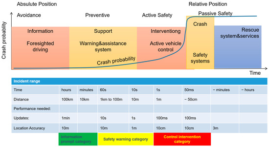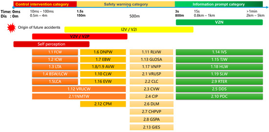 Through the analysis in Figure 3, combined with the scene classification method in Figure 1, based on the different distances before and after the occurrence of a traffic accident, the information service types are divided into information prompt, safety warning and control intervention. This can guide roadside intelligent infrastructure to scientifically and efficiently serve passing vehicles, ensuring safer passage.
