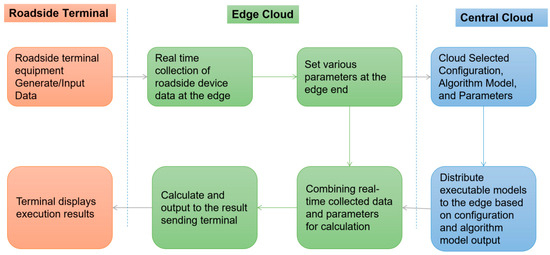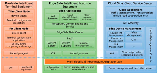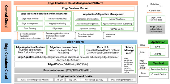 The edge cloud, represented by the edge container cloud, refers to equipment deployed on highways or urban roads with edge computing capabilities and computing power, which mainly includes two categories: an ECU (Edge Computing Unit, ECU) and a regional edge cloud control platform or intelligent intersection edge cloud control platform; in the highway scene, an ECU is deployed along the highway side according to the intelligent road level. In urban road scenarios, ECUs are deployed along urban roads or at intersections according to the level of intelligent intersections, and the regional edge cloud control platform or intelligent intersections edge cloud control platform can be referred to as an edge cloud, which is generally deployed in the data center room of regional road sections or urban road intersections according to the actual deployment environment of the project. An edge container cloud provides container-based digital cloud infrastructure in the form of a proprietary cloud/public cloud. Based on these infrastructures and virtualization technologies, combined with technical capabilities in network computing, storage, security and other aspects, a lightweight, high-performance, high-security edge collaborative control architecture system of an edge container can be formed. Through the opening of this architecture system capability and the combination of soft and hard, it provides a more convenient and exclusive edge container–cloud edge end collaborative control model (Figure 5) for upper-layer applications [12].
