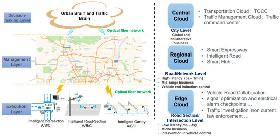 The central cloud system refers to the intelligent road operation control center for vehicle and road collaborative autonomous driving based on the cloud native technology architecture, that is, the cloud native cloud control center. According to the number of highways managed by the service or the number of urban road intelligent intersections, the road belongs to different administrative divisions; the cloud native cloud control center can be divided into two levels, respectively: a regional cloud–native cloud control center and a central cloud–native cloud control center [13]. In a central cloud–native cloud control center for city-level global and collaborative business, typical applications such as traffic TOCC (Transportation Operations Coordination Center, TOCC) or traffic control cloud of traffic command center, the main function is data-driven intelligent decision-making. The regional cloud–native cloud control center is oriented to road and road network applications, and the communication delay is between 3 s–1 min. The typical applications include intelligent high-speed, intelligent road, intelligent hub event recognition, path planning and vehicle end guidance and control, etc. The main function is data-driven intelligent management. The business relationships of various cloud–-native cloud control centers are shown in Figure 6.