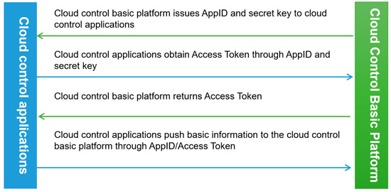 The cloud control basic platform issues the AppID (Application Programming Interface ID, AppID) and secret key (cloud control application registration key) to the cloud control application, and then uses the AppID and secret key to obtain the Token (application registration credentials) from the cloud control basic platform authentication server. Finally, the data interaction is completed through the AppID and Token using RESTful API based on the HTTPS application layer protocol and JSON data format. The blue arrow represents the request sent by the cloud control application to the cloud control basic platform. The green arrow represents the request response of the cloud control basic platform to the cloud control application. The specific interaction process is shown in Figure 9.