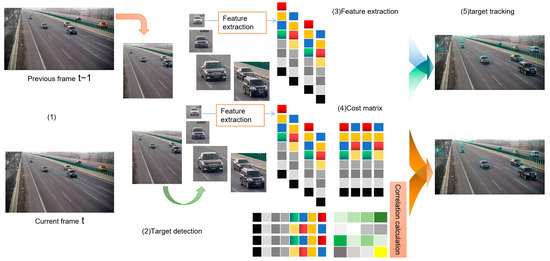 A real-time universal detection model based on StreamYOLO, supporting eight types of traffic object detection. StreamYOLO is based on the YOLOX model and uses a Dual Flow Perception feature fusion module to learn temporal relationships at the feature level, improving the ability to predict environmental perception. At the same time, StreamYOLO designed a Trend Aware Loss to perceive the intensity of object motion changes, which is used to weight the regression of object prediction, enabling objects with drastic changes in motion to obtain higher regression weights and better prediction results. Step (1) is to extract target recognition image frame data. Step (2) is to detect targets in image frames. Step (3) is to extract target features. Step (4) is to perform relevant calculations using the cost matrix algorithm. Step (5) is to output target tracking data in continuous images. The real-time universal detection model for highway vehicle video detection based on StreamYOLO is shown in Figure 11.