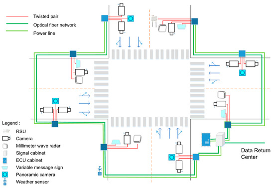 As shown in Figure 13, in the hardware deployment of smart intersections, roadside digital infrastructure such as RSU, cameras, millimeter wave radar, signal cabinets, ECU cabinets, variable message cameras, panoramic cameras, and weather stations are deployed in different directions of the intersection. If multiple poles are combined, the installation poles of the electronic police can be shared. When these numerous sensors are deployed at intersections, in addition to providing power to each device, they also need to be connected through fiber optic networks to form a local area network and provide high computing power and speed computing services at the edge. The green connecting line in Figure 13 represents the fiber optic network.