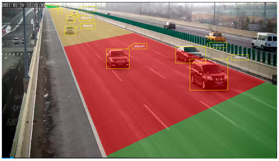 The intelligent infrastructure deployed on highways automatically recognizes the lane lines of highways based on the over-the-horizon scene division model and annotates the videos collected by intelligent cameras with different colors according to the three scene division methods. Video analysis algorithms and vehicle dynamic envelope warning technology are used to identify the size, speed, driving direction, and status of vehicles in real time, to conduct real-time tracking and analysis of vehicles passing through this area, and to provide cloud edge application services in three different states [16]. The intelligent infrastructure for vehicle recognition, tracking and cooperative control based on over-the-horizon scene partitioning is shown in Figure 14.