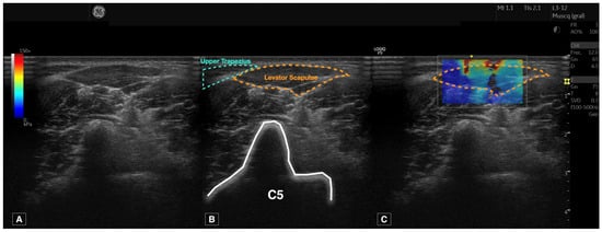 Raw ultrasound imaging acquired at the C5 level (A), contouring the targeted structure (levator scapulae) and references used (upper trapezius and transverse process of C5) (B) and shear wave elastography imaging (C).