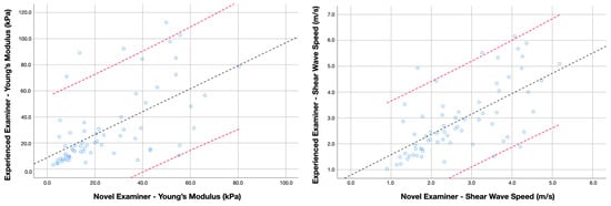 For the inter-examiner reliability analyses, six metrics were calculated for Young’s modulus and shear wave speed: (1) the mean average and standard deviation from both examiners, (2) the absolute error between examiners, (3) the intraclass correlation coefficients (ICC3,2, 2-way mixed model consistency type), (4) the standard error of measurement (SEM = Standard deviation of the mean average × ), and (5) the minimal detectable changes (MDC = SEM × × 1.96) [31]. Finally, four Bland–Altman plots (two for cases and two for controls, including Young’s modulus and shear wave speed scores obtained by each examiner, the regression line, and 95% confidence interval) were built to illustrate the agreement between two quantitative measurements.
