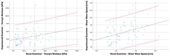 Bland–Altman plot comparing Young’s modulus and shear wave speed scores obtained by the experienced and novel examiner in asymptomatic subjects. Lines represent the regression line (black) and the 95% confidence interval (red).