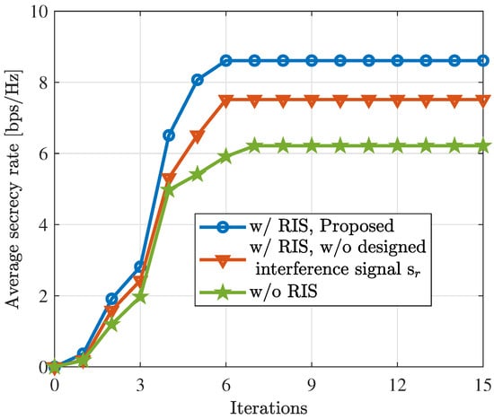 Convergence of the proposed algorithm for scenarios with RIS, without RIS, and without the designed interference signal. ‘w/o’ and ‘w/ ’ stand for without and with, respectively.