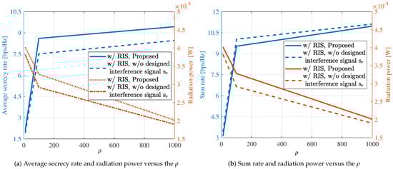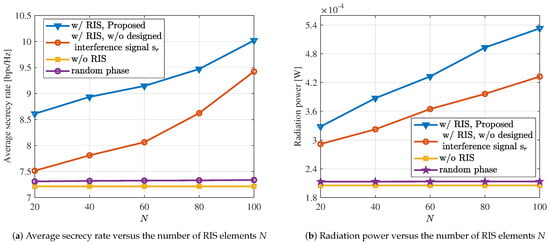 In Figure 5a, we compare the average secrecy rate with the number of RIS elements N. We can see that the performance of all schemes, except for the case without RIS, increases with the increment of N. Furthermore, compared to the method without the designed interference signals, the proposed approach achieves significant performance improvement. Specifically, when , the average secrecy rate of the system increases by 15%. Similarly, in Figure 5b, we compare the radiation power with the number of RIS elements N. It can be observed that the radiation power gradually increases with the increment of N. At , the system’s radiation power increases by 18%. Additionally, we find that the proposed approach exhibits a significant improvement in sensing performance. Combining the results from Figure 5a,b, the proposed algorithm significantly enhances the performance of the ISAC system. The introduction of RIS and interference signals has significantly enhanced the ISAC system’s performance.