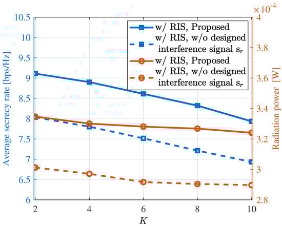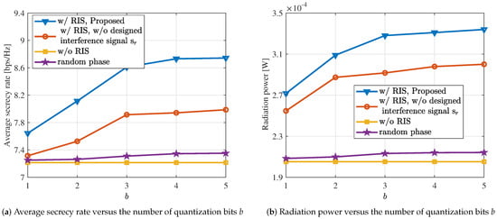 In Figure 6, the achievable average secrecy rate and radiation power of the system are plotted against the increasing bit quantization number, ranging from 1 to 5. In Figure 6a, we can observe a clear advantage of the proposed approach in terms of secrecy rate. In the presence of interference signals, the average secrecy rate can be increased by up to 10%. Additionally, we observed that the bit quantization number increases from 1 to 4, and then from 4 to 5; the average secrecy rate remains relatively constant. This suggests that the system’s performance reaches a saturation point once the quantization bit number exceeds 4. Similarly, in Figure 6b, we can also observe a significant increase in radiation power with the addition of RIS and the introduction of interference signals. Likewise, as the quantization bit number varies, a phenomenon similar to Figure 6a is evident.