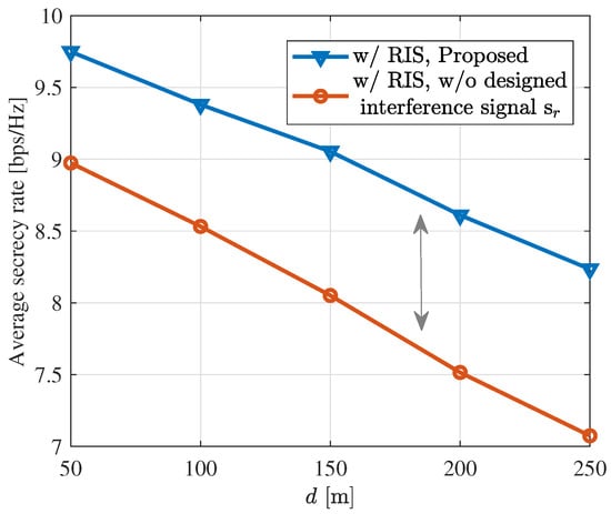 Figure 7 illustrates the average secrecy rate of legitimate users when , while moving the RIS from (50 m, 0 m) to (250 m, 0 m). It can be observed that as the distance between RIS and BS increases, the ISAC system’s secrecy rate decreases and its security performance is weaker. Additionally, we also observe that under the same power constraints, introducing interference signals can provide a better secrecy rate.