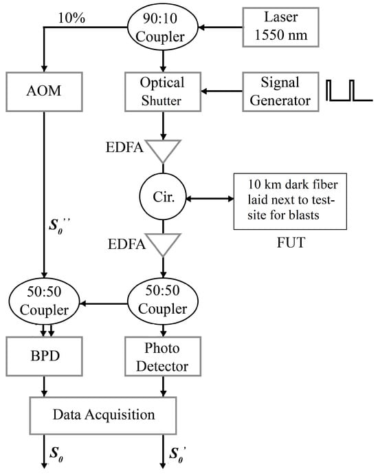 Experimental setup of -OTDR used to interrogate a 10 km dark fiber link surrounding the blast test site. EDFA: erbium-doped fiber amplifier, FUT: fiber-under-test, BPD: balanced photodetector, Cir.: circulator, AOM: acousto-optic modulator.