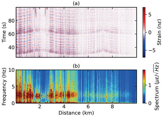 (a) Distance–time contour plot of strain data from -OTDR and its (b) spectrum.