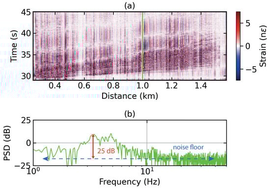 (a) Distance–time contour plot of a section of strain data from -OTDR used for dispersion analysis; (b) power spectral density (PSD) of a time series of strain at a fiber distance of 1 km (marked by a vertical green line in (a)), where the vertical red line indicates the signal-to-noise ratio (SNR) and the horizontal dotted line indicates the noise floor.