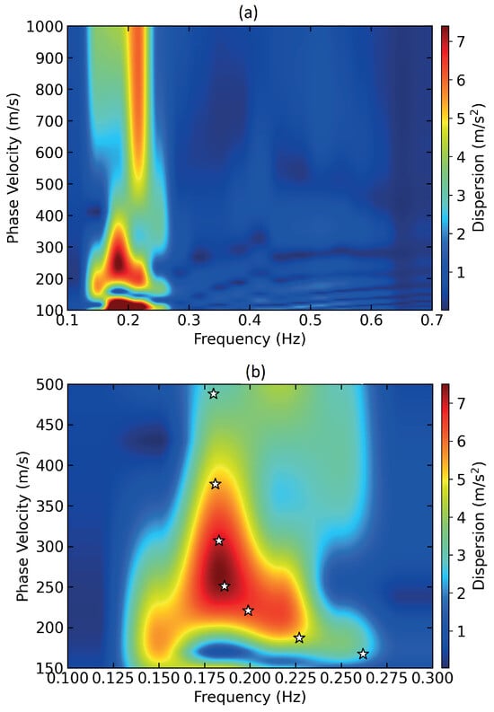 (a) Dispersion image; (b) fundamental mode of Rayleigh wave where white-colored stars indicate the dispersion curve.