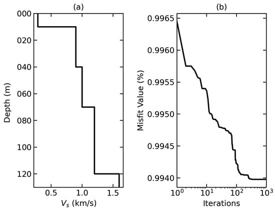 (a) Depth vs. shear wave velocity, , profile obtained from inversion of the dispersion curve, (b) misfit values corresponding to (a).