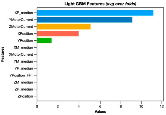As can be seen, the most important feature, enhancing the component degradation detection performance of the LGBM, is the median value of the X-axis position, while the FFT of the Y-axis position does not contribute at all to the performance. An interesting fact is that, in the XGBoost, the feature importance values are significantly different. Specifically, the most important feature enhancing the tool wear/component degradation performance is the motor current of the Z-axis.