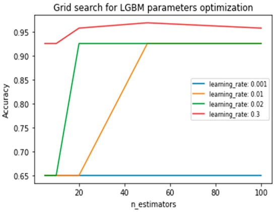 The LGBM algorithm was fine-tuned in order to ensure its efficacy. The most significant parameters that were fine-tuned were (1) the learning rate, which determines the step size at each iteration while moving towards the minimum of a binary log loss function, and (2) the number of estimators, which defines the number of gradient-boosted trees, equivalent to the number of boosting rounds. The optimal parameters were computed by performing a grid search, using 10-fold cross-validation for the aforementioned model parameters, evaluating a series of values: (1) the number of estimators = (5, 10, 20, 50, 100), (2) the learning rate = (0.001, 0.01, 0.02, 0.3). The maximum value for the learning rate was set to 0.3 in order to ensure a detailed search and avoid skipping a possible minimum. The results are summarized in Table 3.